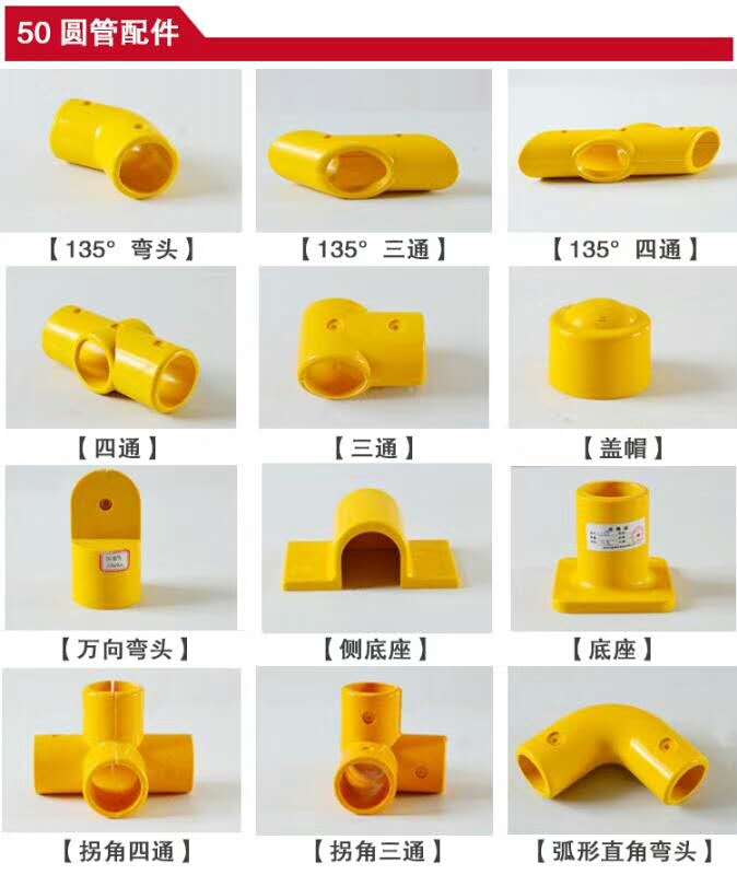玻璃鋼圍欄配件:三通,四通,彎頭,底座,萬向接頭等。