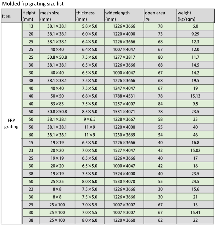 玻璃鋼格柵規(guī)格型號(hào)表: